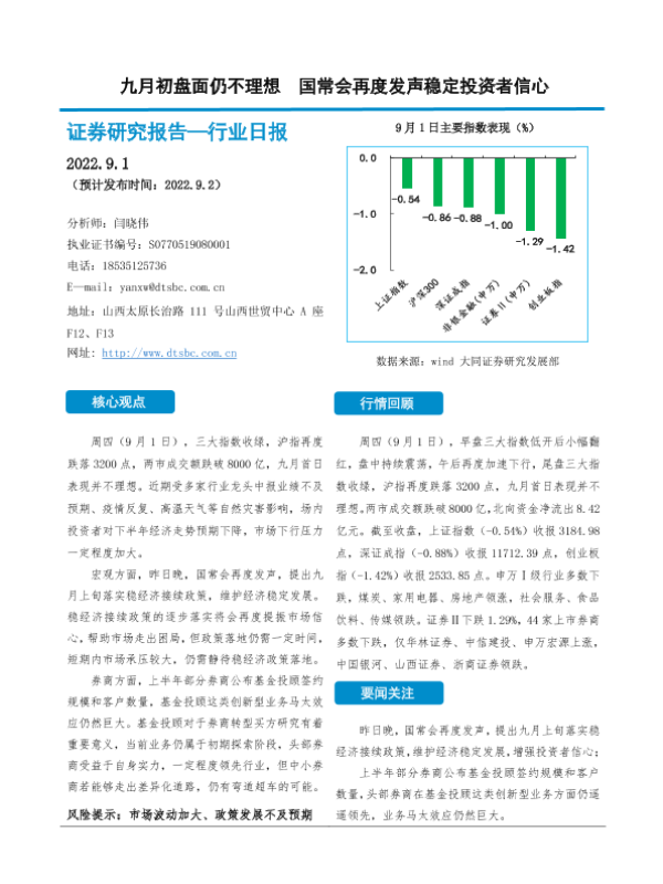 【大同证券】【20220901】九月初盘面仍不理想 国常会再度发声稳定投资者信心-11页 行业研究