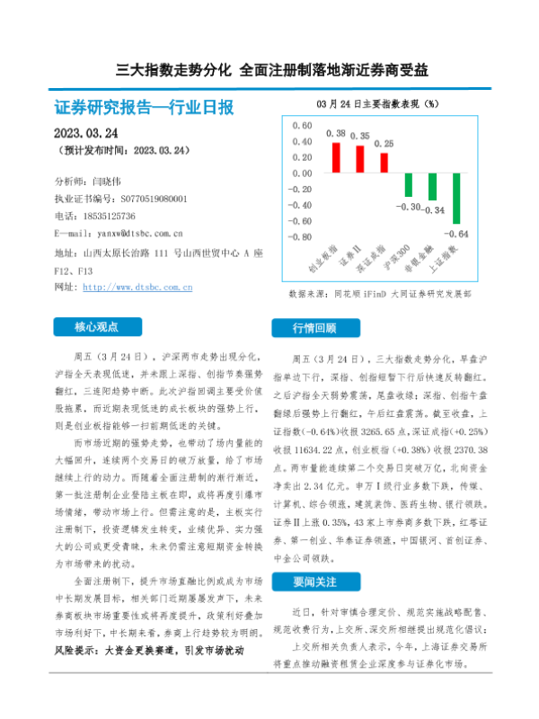 【大同证券】【20230324】证券行业日报:三大指数走势分化 全面注册制落地渐近券商受益-10页 行业研究