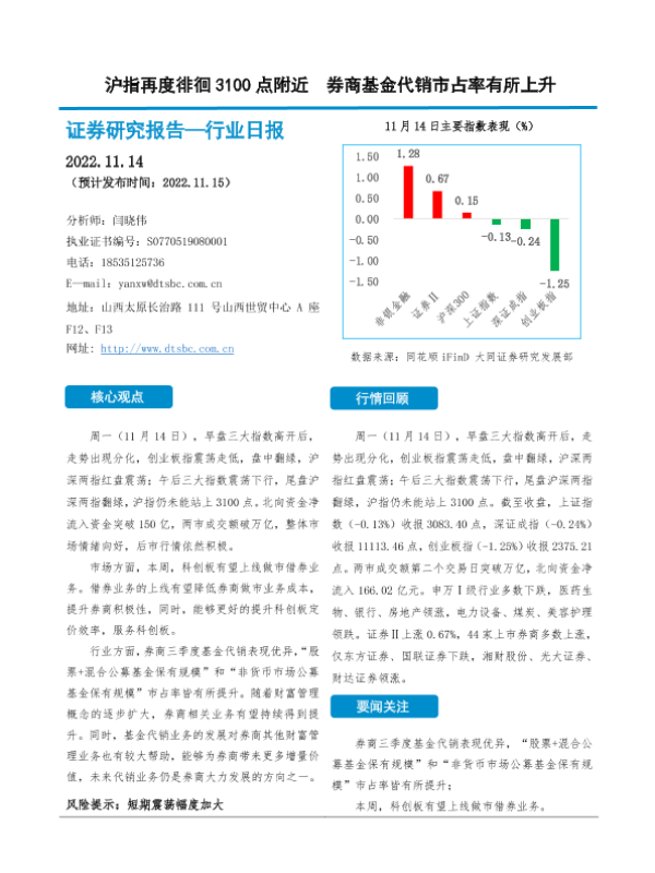 【大同证券】【20221114】沪指再度徘徊3100点附近 券商基金代销市占率有所上升-10页 行业研究