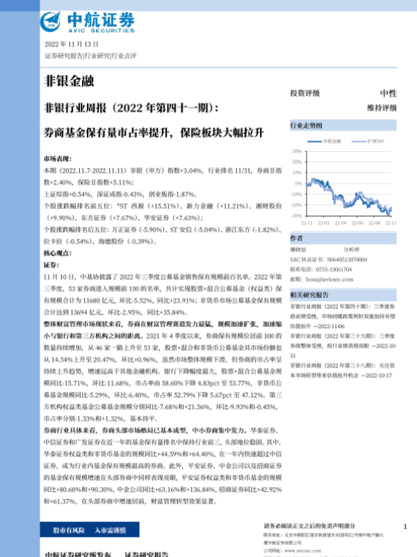 【中航证券】【20221113】非银行业周报:券商基金保有量市占率提升,保险板块大幅拉升-12页 行业研究