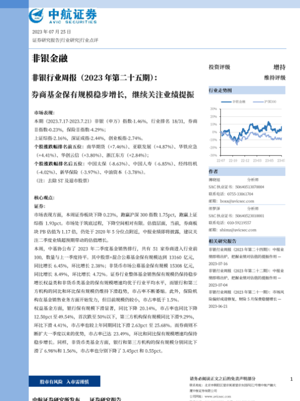 【中航证券】【20230725】非银行业周报:券商基金保有规模稳步增长,继续关注业绩提振-12页 行业研究