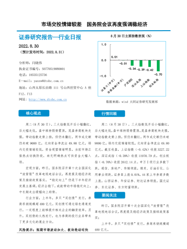 【大同证券】【20220830】非银金融行业日报:市场交投情绪较差 国务院会议再度强调稳经济-11页 行业研究