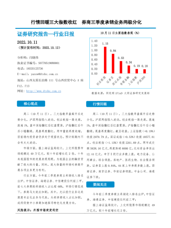 【大同证券】【20221011】行情回暖三大指数收红 券商三季度承销业务两极分化-10页 行业研究