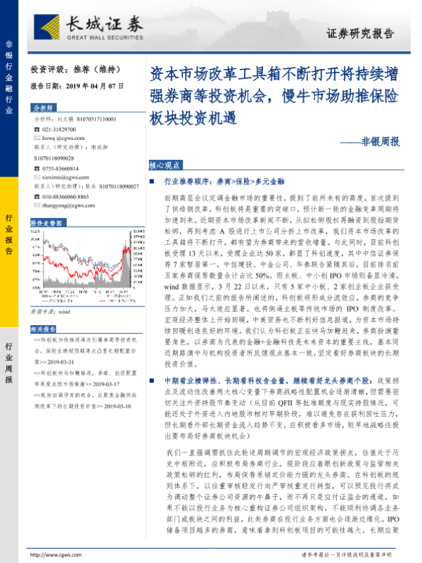 【长城证券】【20190407】非银周报:资本市场改革工具箱不断打开将持续增强券商等投资机会,慢牛市场助推保险板块投资机遇-35页 行业研究