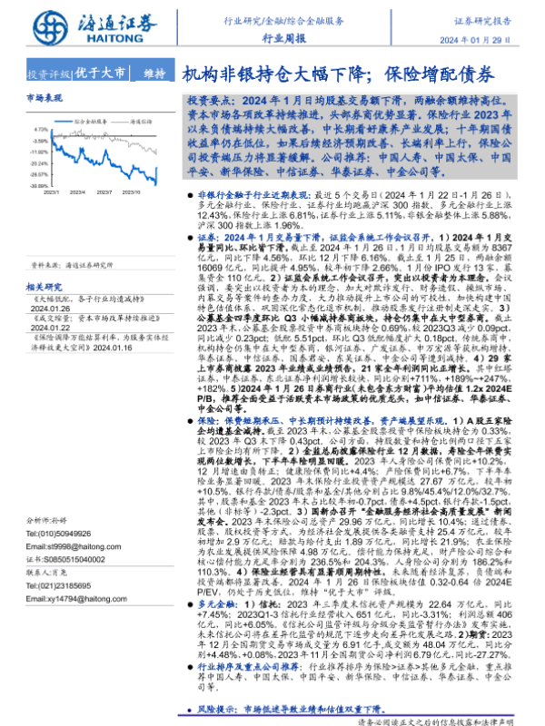【海通证券】【20240129】综合金融服务行业周报:机构非银持仓大幅下降;保险增配债券-13页 行业研究