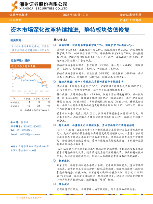 【湘财证券】【20220510】证券行业双周报:资本市场深化改革持续推进,静待板块估值修复-10页 行业研究