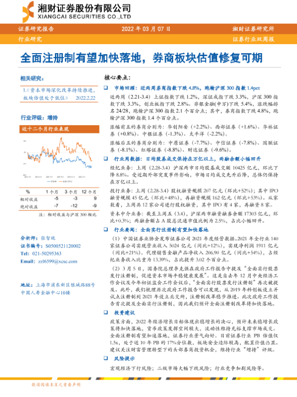 【湘财证券】【20220307】证券行业双周报:全面注册制有望加快落地,券商板块估值修复可期-10页 行业研究