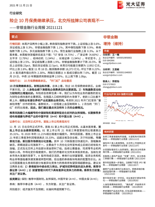 【光大证券】【20211121】非银金融行业周报:险企10月保费继续承压,北交所挂牌公司表现不一-10页 行业研究