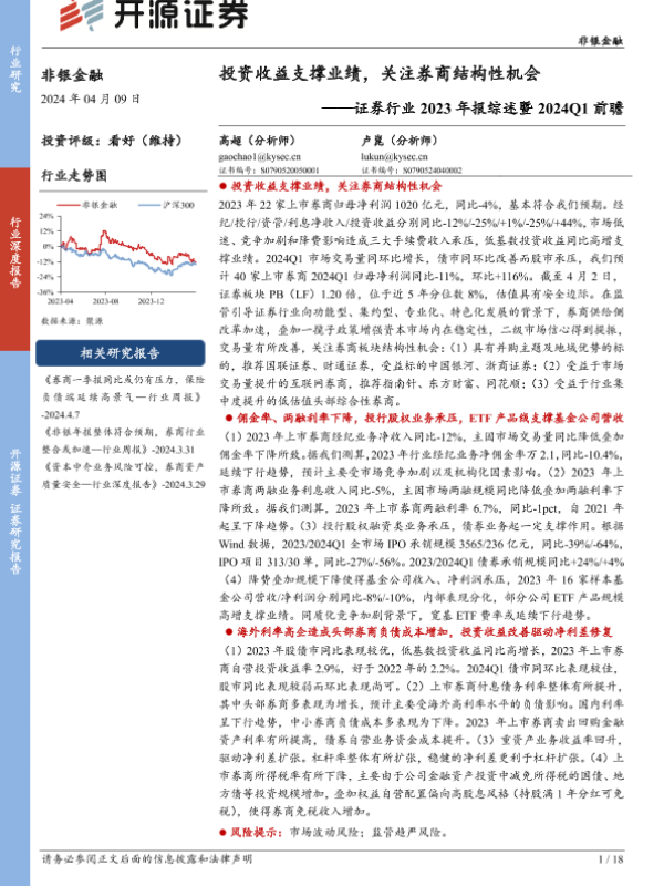 【开源证券】【20240409】非银金融证券行业2023年报综述暨2024Q1前瞻:投资收益支撑业绩,关注券商结构性机会-18页 行业研究