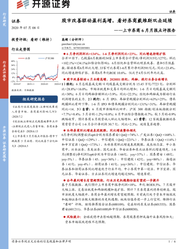 【开源证券】【20200708】上市券商6月月报点评报告:股市改善驱动盈利高增,看好券商戴维斯双击延续-6页 行业研究