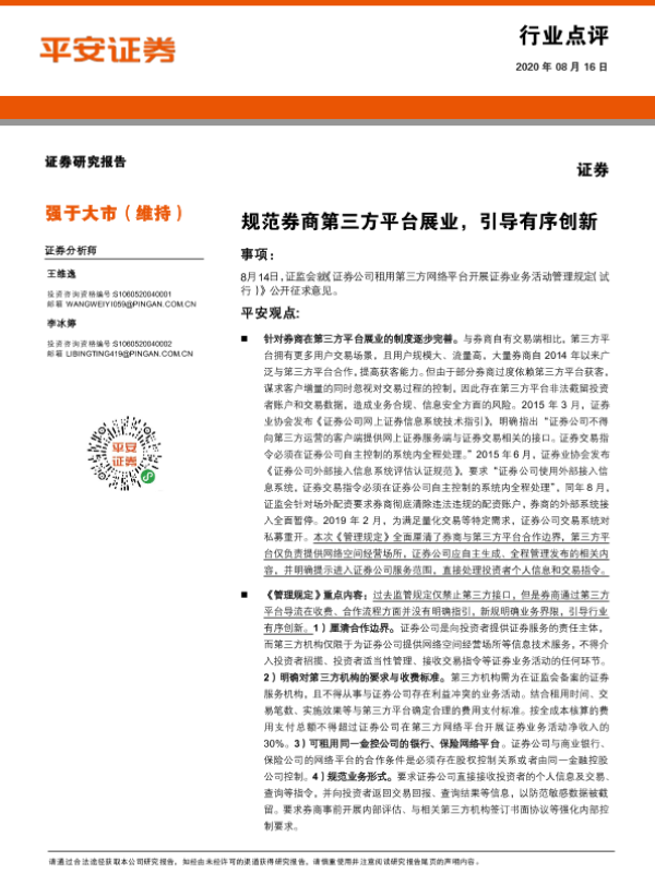 【平安证券】【20200816】规范券商第三方平台展业,引导有序创新-4页 行业研究
