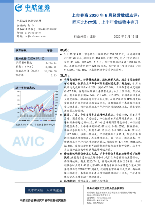 【中航证券】【20200712】上市券商2020年6月经营数据点评:同环比均大涨,上半年业绩稳中有升-5页 行业研究