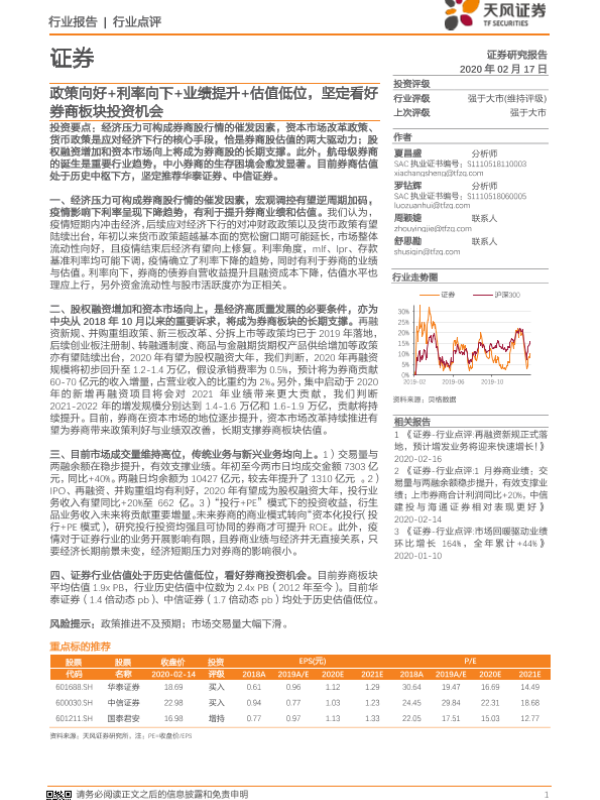 【天风证券】【20200217】证券:政策向好+利率向下+业绩提升+估值低位,坚定看好券商板块投资机会-2页 行业研究