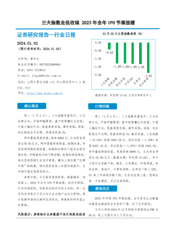 【大同证券】【20240102】非银金融行业日报:三大指数走低收绿 2023年全年IPO节奏放缓-10页 行业研究