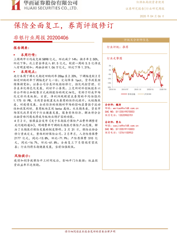 【华西证券】【20200406】非银行业周报:保险全面复工,券商评级修订-12页 行业研究