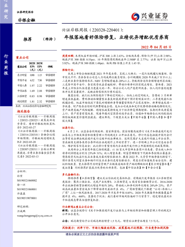 【兴业证券】【20220405】兴证非银周报:年报落地看好保险修复,业绩优异增配优质券商-15页 行业研究