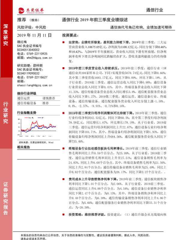 【东莞证券】【20191111】通信行业2019年前三季度业绩综述:通信换代号角已吹响,业绩加速可期待-14页 行业研究