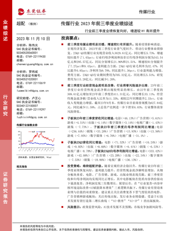 【东莞证券】【20231110】传媒行业2023年前三季度业绩综述:行业前三季度业绩恢复向好,增速较H1有所提升-28页 行业研究