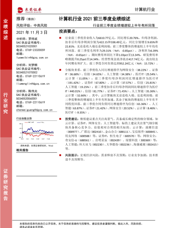 【东莞证券】【20211103】计算机行业2021前三季度业绩综述:行业前三季度业绩增速较上半年有所回落-20页 行业研究