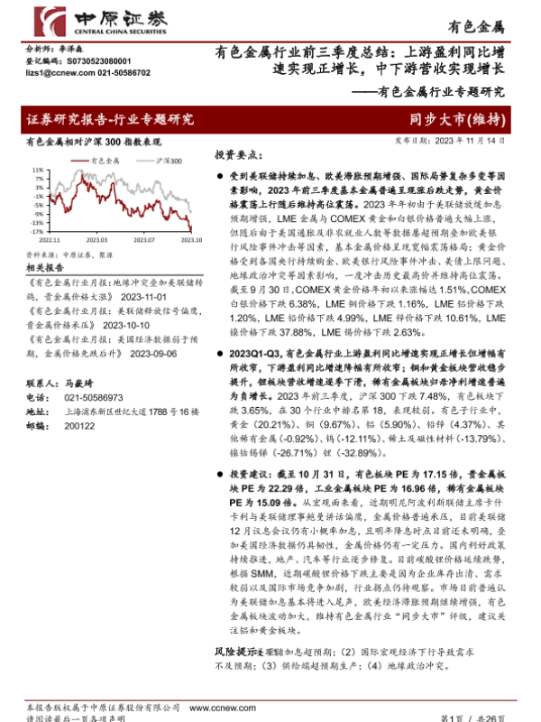 【中原证券】【20231114】有色金属行业前三季度总结:上游盈利同比增速实现正增长,中下游营收实现增长-26页 行业研究