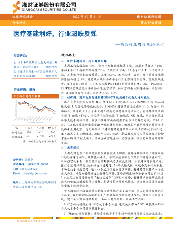 【湘财证券】【20221013】药品行业周报:医疗基建利好,行业超跌反弹-13页 行业研究