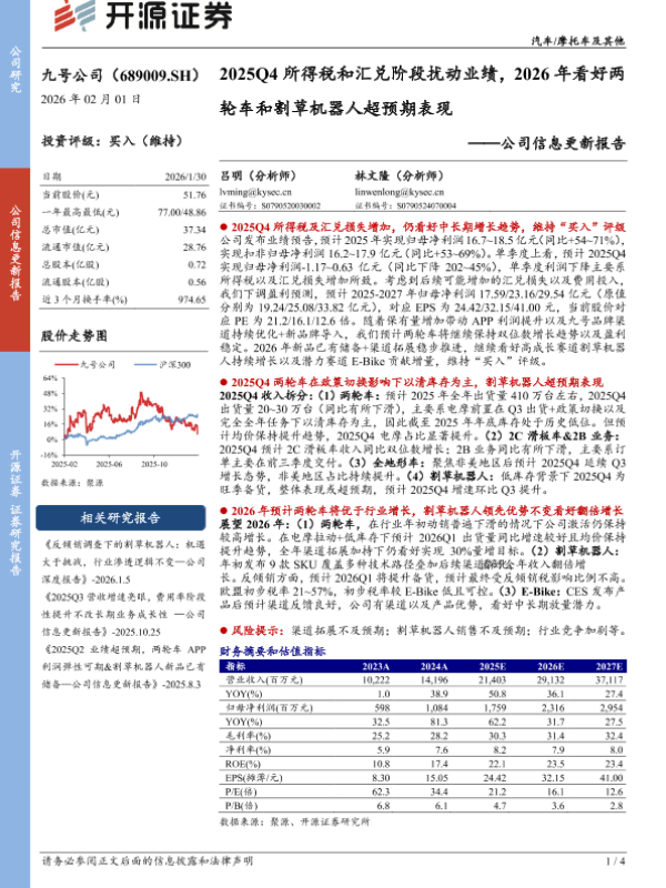 【开源证券】【202601】2025Q4所得税和汇兑阶段扰动业绩,2026年看好两轮车和割草机器人超预期表现-4页 公司研究