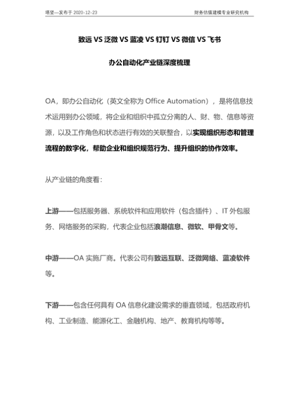 【并购优塾】【20201223】致远VS泛微VS蓝凌VS钉钉VS微信VS飞书:办公自动化产业链深度梳理-21页 行业研究