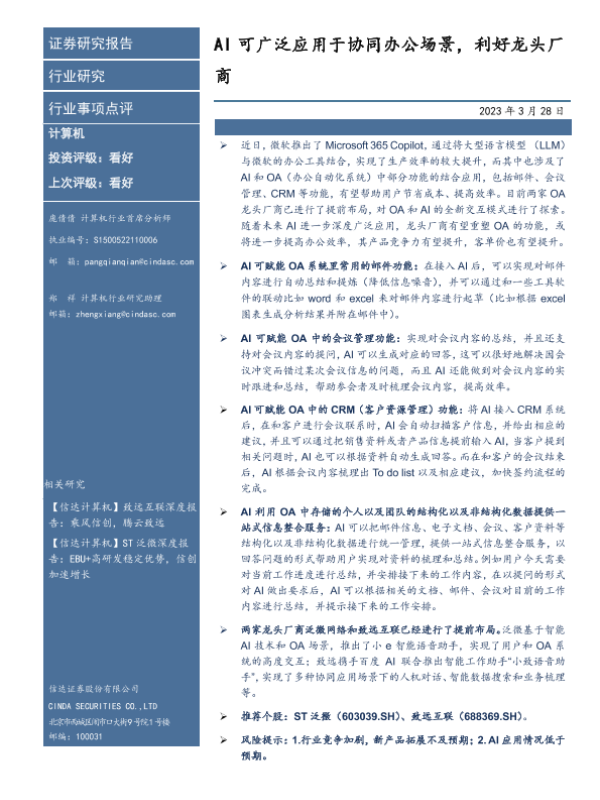【信达证券】【20230328】AI可广泛应用于协同办公场景,利好龙头厂商-10页 行业研究