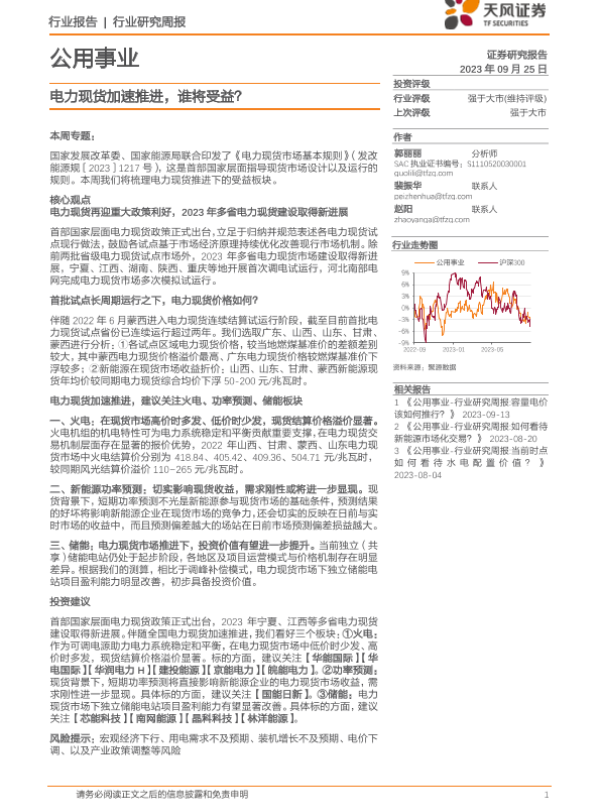 【天风证券】【20230925】公用事业行业研究周报:电力现货加速推进,谁将受益?-16页 行业研究