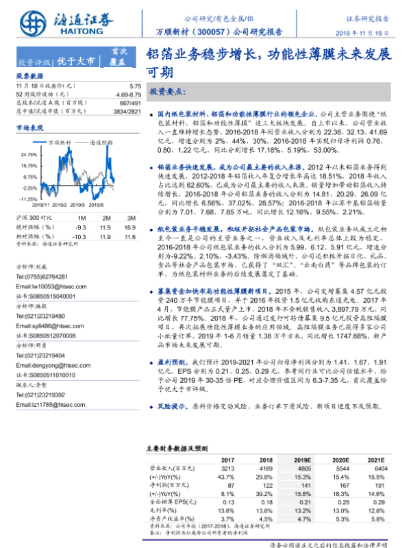 【海通证券】【20191119】万顺新材-300057.SZ-公司研究报告:铝箔业务稳步增长,功能性薄膜未来发展可期-21页 行业研究