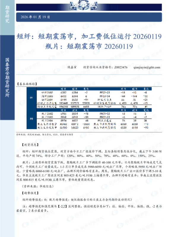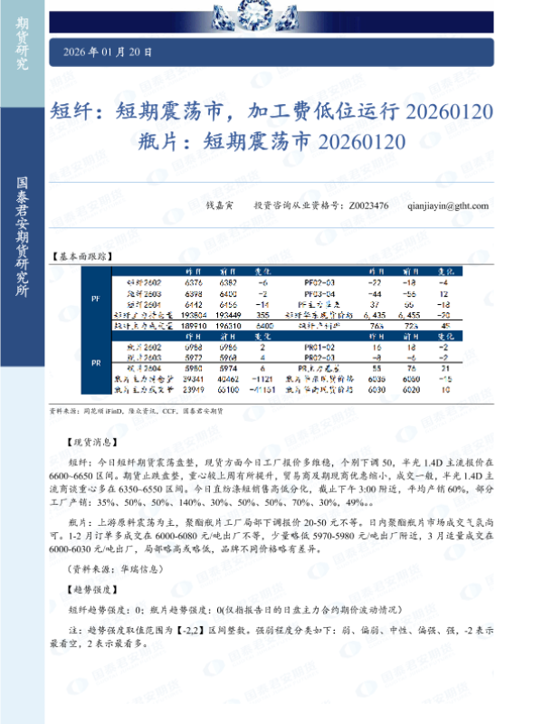 【国泰君安期货】【202601】短纤:短期震荡市,加工费低位运行 瓶片:短期震荡市-2页 证券期货研究报告