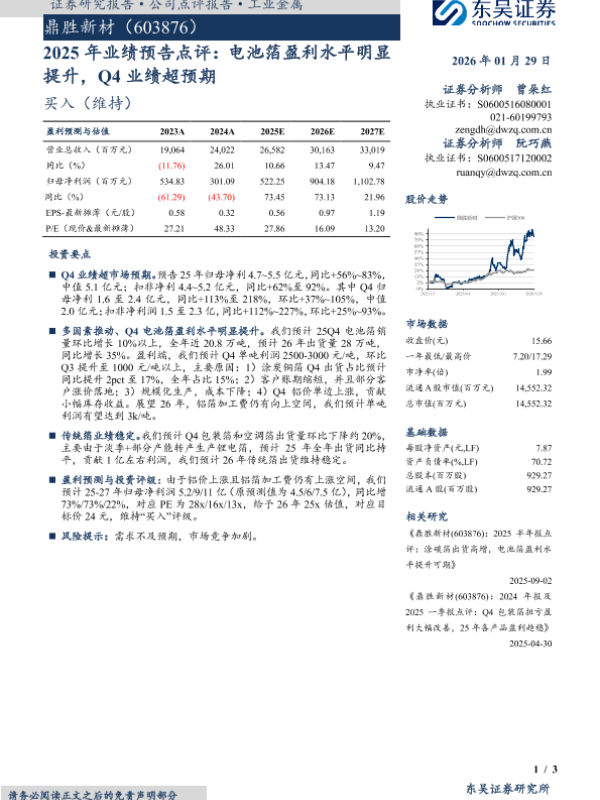 【东吴证券】【202601】2025年业绩预告点评:电池箔盈利水平明显提升,Q4业绩超预期-3页 证券期货研究报告