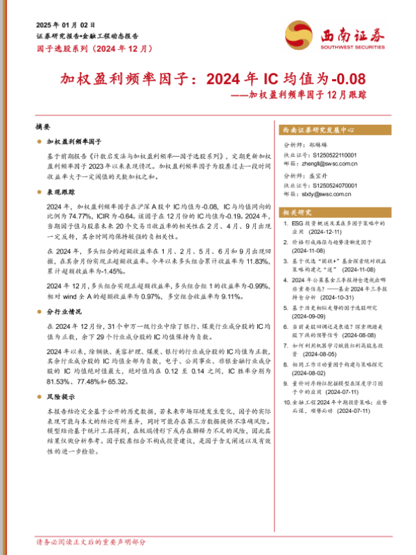 【西南证券】【20250110】2025年01月10日更新-【西南证券】加权盈利频率因子12月跟踪:加权盈利频率因子,2024年IC均值为-0.08-11页 行业研究