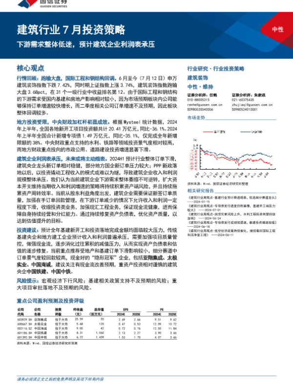 【国信证券】【20240716】建筑行业7月投资策略:下游需求整体低迷,预计建筑企业利润表承压-19页 行业研究