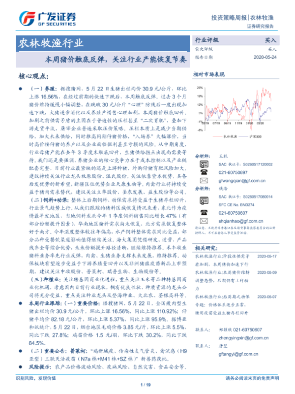 【广发证券】【20200524】20200524-广发证券-农林牧渔行业:本周猪价触底反弹,关注行业产能恢复节奏-19页 行业研究