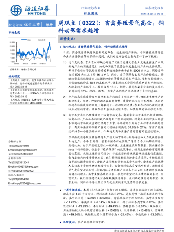 【海通证券】【20200322】农业周观点:畜禽养殖景气高企,饲料动保需求趋增-4页 行业研究