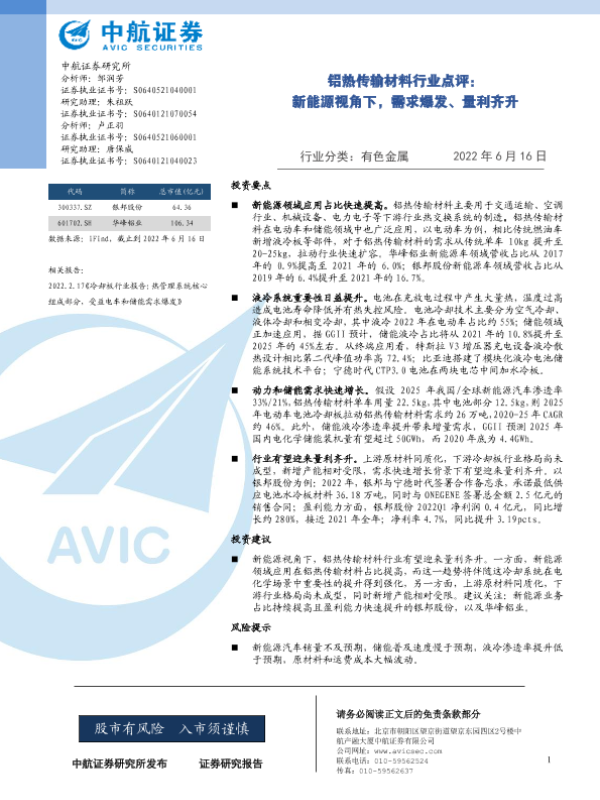 【中航证券】【20220616】铝热传输材料行业点评:新能源视角下,需求爆发、量利齐升-2页 证券期货研究报告