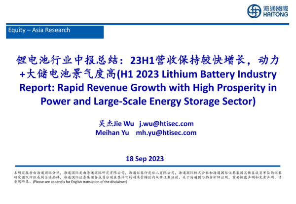 【海通国际】【20230918】23H1营收保持较快增长,动力+大储电池景气度高-37页 行业研究