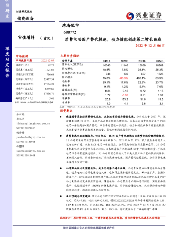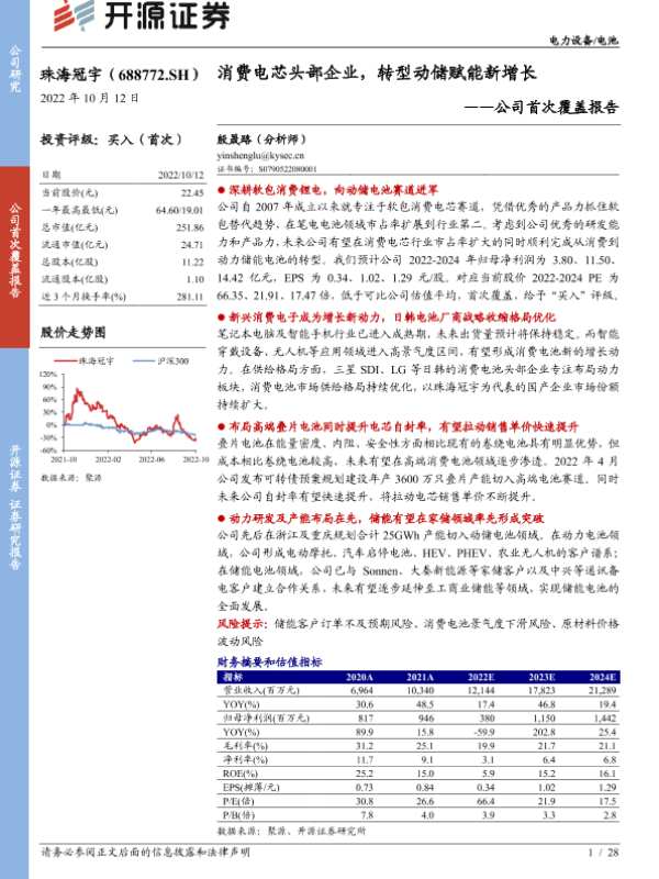【开源证券】【20221012】20221012-开源证券-珠海冠宇-688772.SH-公司首次覆盖报告:消费电芯头部企业,转型动储赋能新增长-28页 行业研究