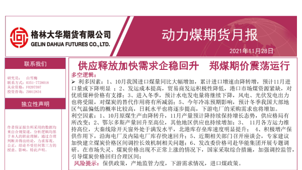 【格林大华期货】【20211128】动力煤期货月报:供应释放加快需求企稳回升,郑煤期价震荡运行-22页 行业研究