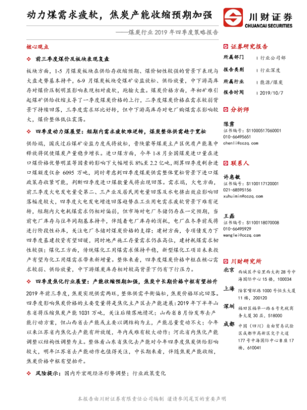 【川财证券】【20191007】煤炭行业2019年四季度策略报告:动力煤需求疲软,焦炭产能收缩预期加强-19页 行业研究