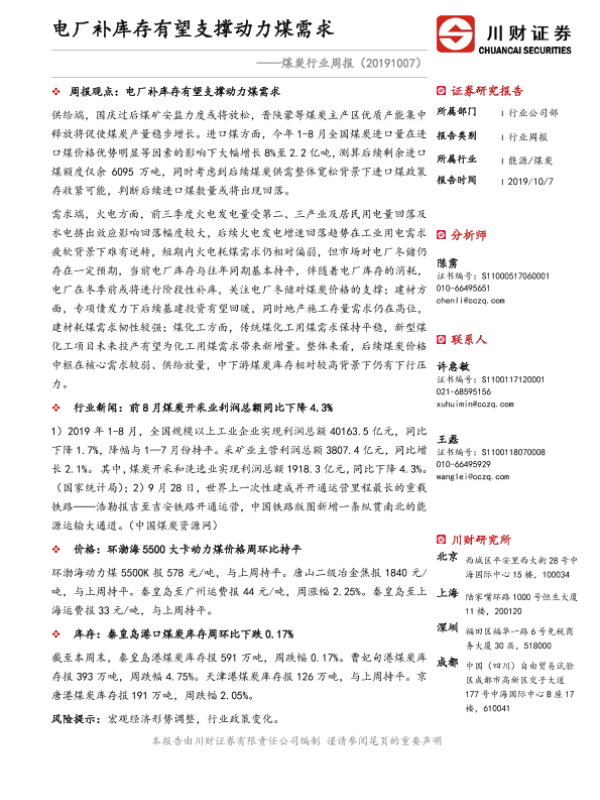 【川财证券】【20191007】20191007-川财证券-煤炭行业周报:电厂补库存有望支撑动力煤需求-14页 行业研究