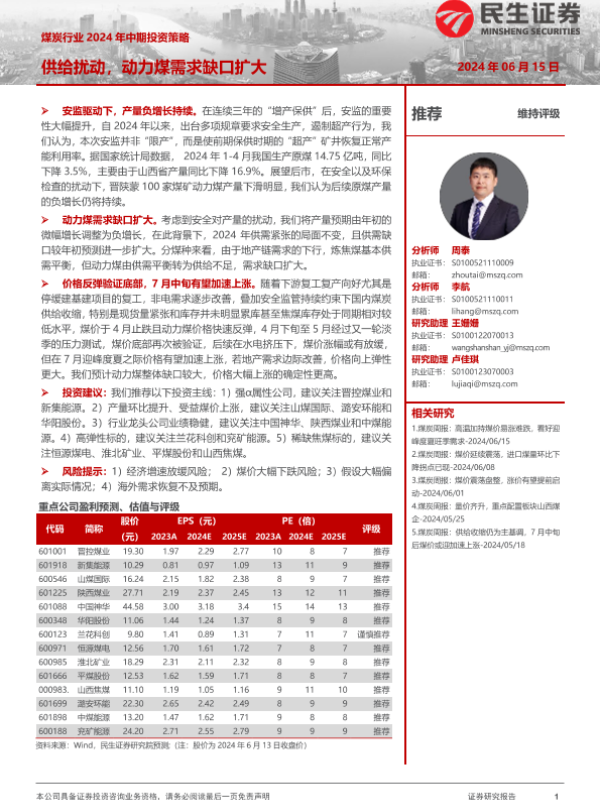 【民生证券】【20240615】煤炭行业2024年中期投资策略:供给扰动,动力煤需求缺口扩大-20页 行业研究