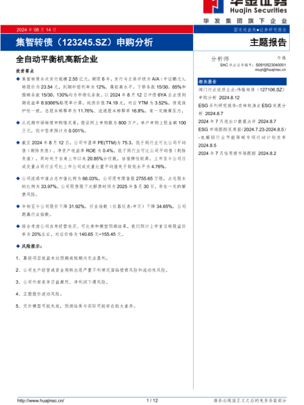 【华金证券】【20240814】集智转债(123245.SZ)申购分析:全自动平衡机高新企业-12页 行业研究