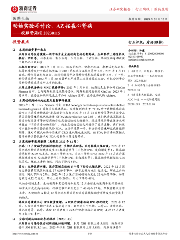 【浙商证券】【20230115】医药生物投融资周报:动物实验再讨论,AZ拓展心肾病-14页 行业研究