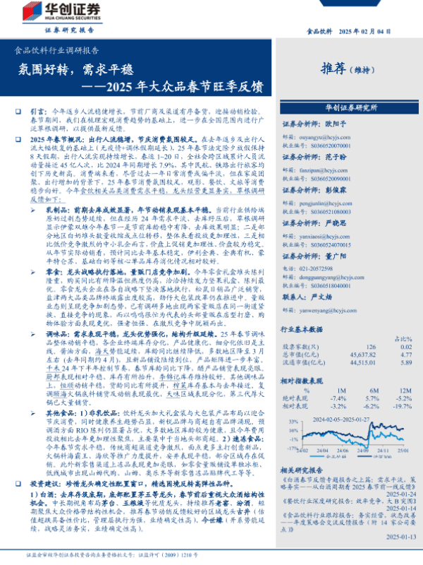 【华创证券】【20250204】食品饮料行业调研报告-2025年大众品春节旺季反馈:氛围好转,需求平稳-23页 行业研究