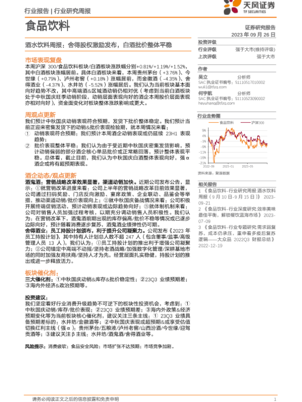 【天风证券】【20230926】20230926-天风证券-酒水饮料周报:舍得股权激励发布,白酒批价整体平稳-16页 行业研究