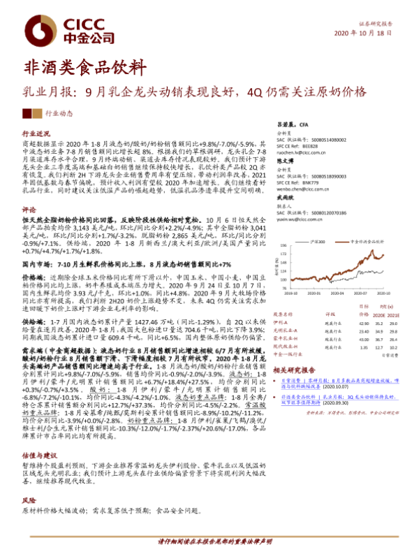 【中金公司】【20201018】乳业月报:9月乳企龙头动销表现良好,4Q仍需关注原奶价格-18页 行业研究