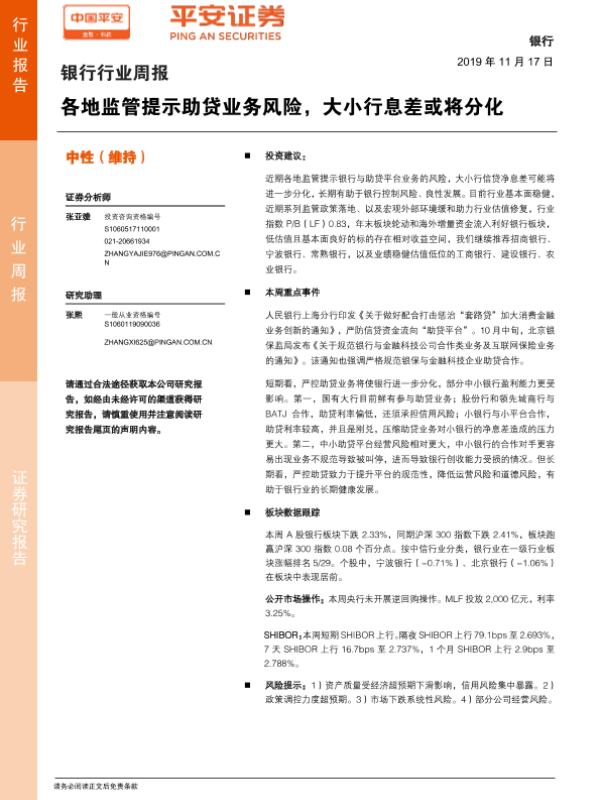 【平安证券】【20191117】银行行业周报:各地监管提示助贷业务风险,大小行息差或将分化-5页 行业研究