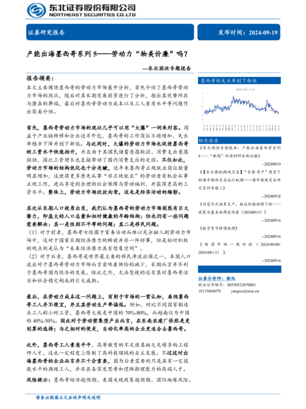 【东北证券】【20240919】产能出海墨西哥系列5:劳动力“物美价廉”吗?-19页 行业研究